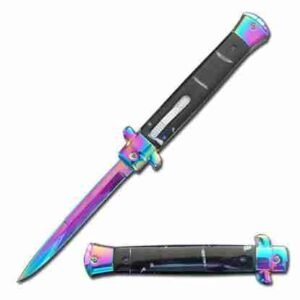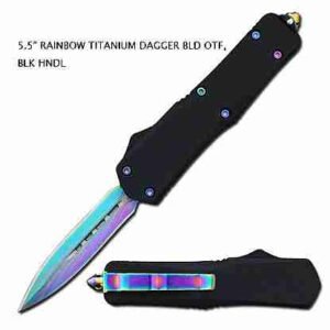 OTF KNIFE.RAINBOW TITANUIM COATED STAINLESS STEEL DAGGER BLADE, BLACK HANDLE WITH MOLLE NYLON SHEATH