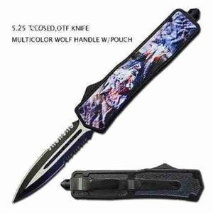 STAINLESS STEEL BLADE 3D MULTI COLOR WOLF DESIGN ZINC ALLOY HANDLE WITH CLIP INCLUDES MOLLE NYLON SHEATH