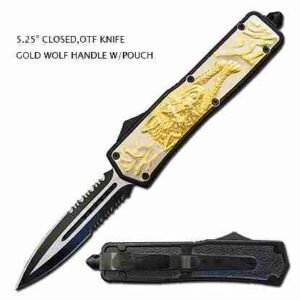 STAINLESS STEEL BLADE GOLD PLATED WOLF DESIGN ZINC ALLOY HANDLE WITH CLIP INCLUDES MOLLE NYLON SHEATH