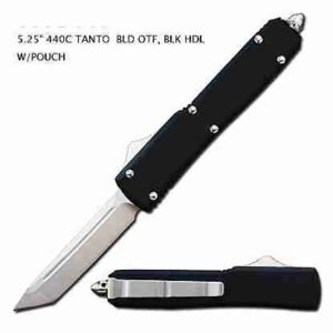 OTF KNIFE.BLACK STAINLESS STEEL TANTO BLADE, BLACK HANDLE WITH MOLLE NYLON SHEATH